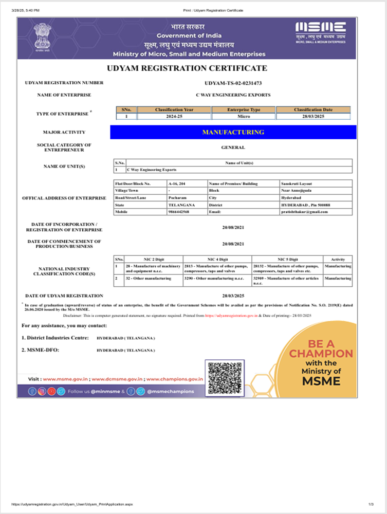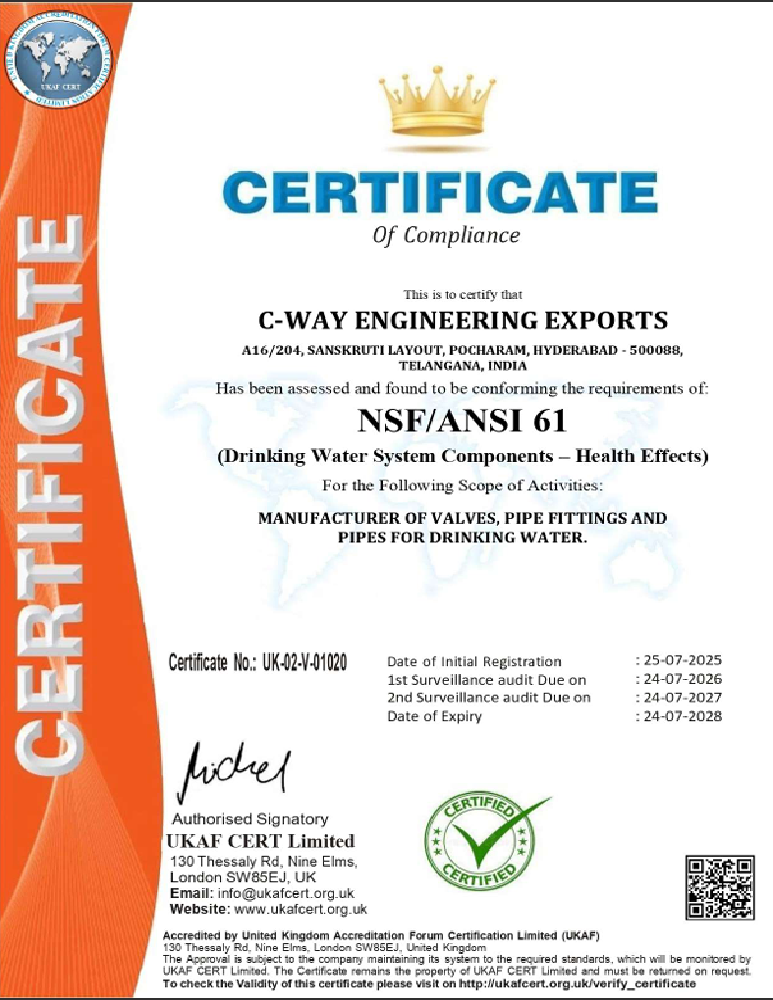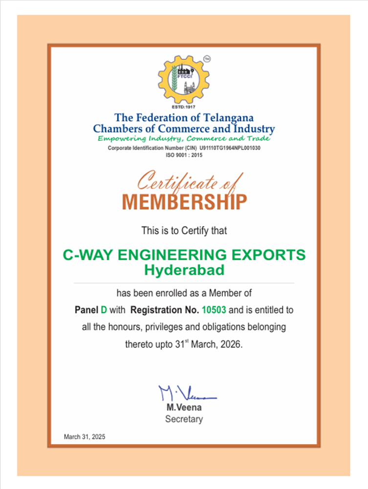 At C-Way Engineering Exports, quality is at the core of everything we do. Our ISO 9001-2015 certification underscores our relentless pursuit of excellence. We continuously push the boundaries of industry standards, ensuring that our products consistently deliver exceptional performance and unmatched reliability.